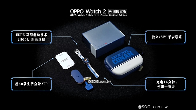 OPPO Watch 2 柯南限定版採用白色錶帶,搭配藍色動漫圖示,原廠取名為「命運之輪」;內建 10 種專屬錶盤,並將柯南、灰原等動漫人物放到久坐通知畫面中。專用充電器也可看到《名偵探柯南》元素,代表的藍色中間印上配角毛利小五郎的頭像;同時藍、白配色打造專屬收納包。