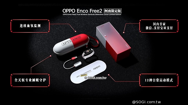 OPPO 手環柯南限定版取材《名偵探柯南》動漫中,一大重要元素「APTX-4869」,其收納包就打造成紅白膠囊的樣貌,手環腕帶也是白底搭配紅色圖示,充電器也採相同配色;限定版手環同時內建 5 種專屬桌面。其他規格與一般版 OPPO 手環一致,支援連續血氧偵測、全天候睡眠守護、12 種日常運動模式。