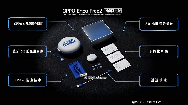 OPPO Enco Free2 真無線耳機柯南限定版與前述產品不同,則是將動漫中另一個熱門配角「怪盜基德」配色與撲克牌特色融入產品中。耳機、充電盒、專屬收納包都採藍白配色、並印上怪盜基德相關圖示;同時充電盒側邊藍色邊條的圖示採用溫感油墨,人手觸摸後會變色。OPPO 另針對限定耳機打造訂製連接特效,並邀請身聲優配製專屬音效台詞。