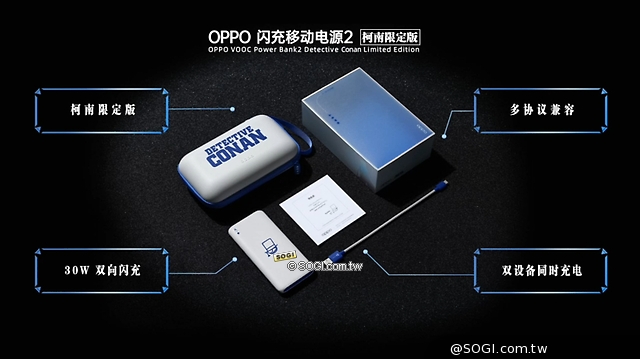 OPPO VOOC 閃充行動電源 2 柯南限定版也取材「怪盜基德」特色,將其專屬撲克牌設計印在行動電源上,整體也是白色底搭配藍色圖示,同樣打造藍白專屬收納包與充電線。