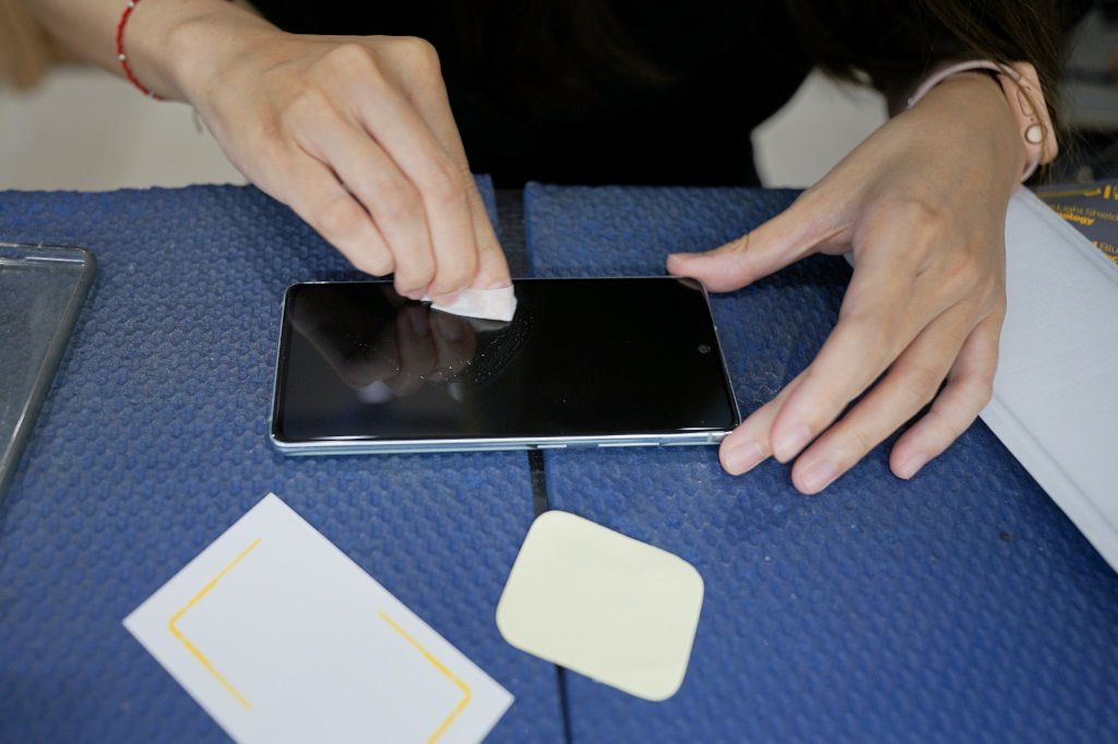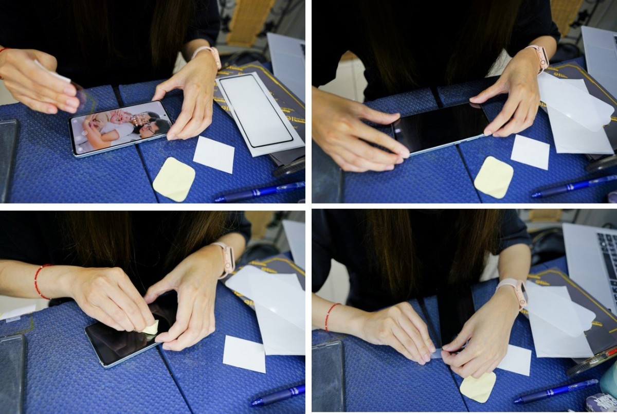 服務人員先幫我把舊的螢幕保護貼撕除,清潔手機螢幕後,貼上新的藍光盾抗藍光螢幕保護貼,檢查是否有小泡泡的地方,馬上處理掉,整個過程有沒有五分鐘啊!!