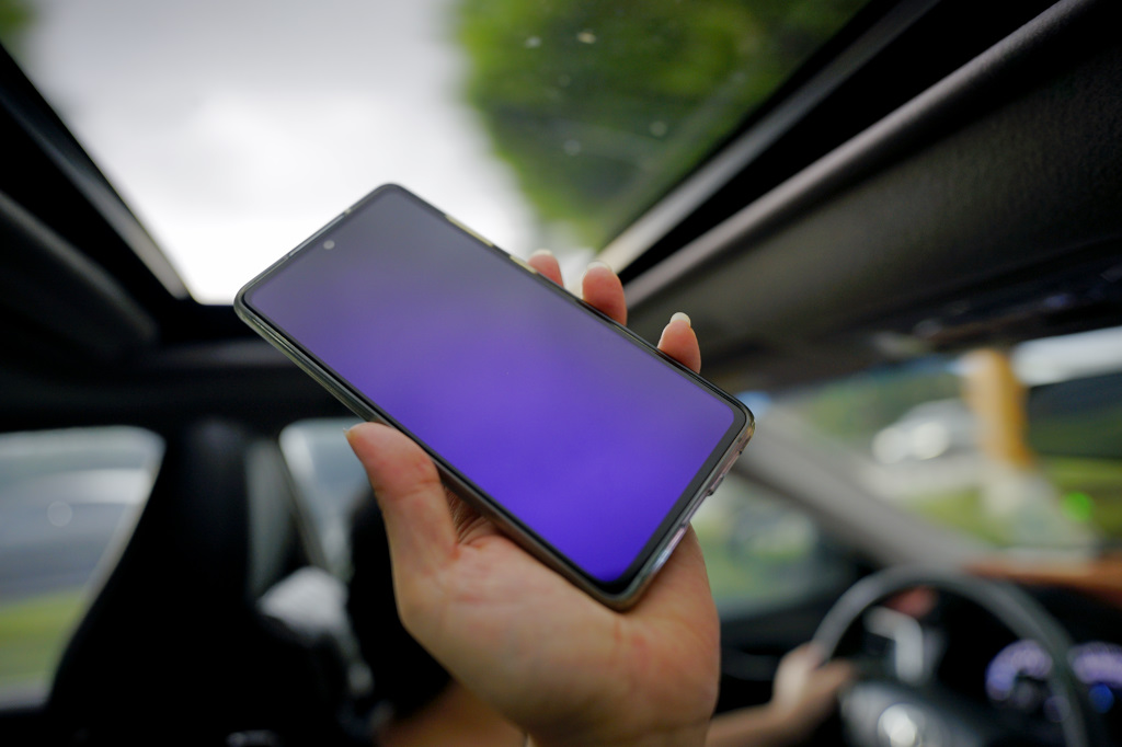 用了藍光盾的抗藍光螢幕保護貼,手機螢幕在太陽底下會是呈現偏藍色的狀態,以前查之所以在太陽照射下變成藍色,是因為太陽光含有比3C螢幕還多的大量藍光,在室內沒有陽光的地方看就不會藍藍的。