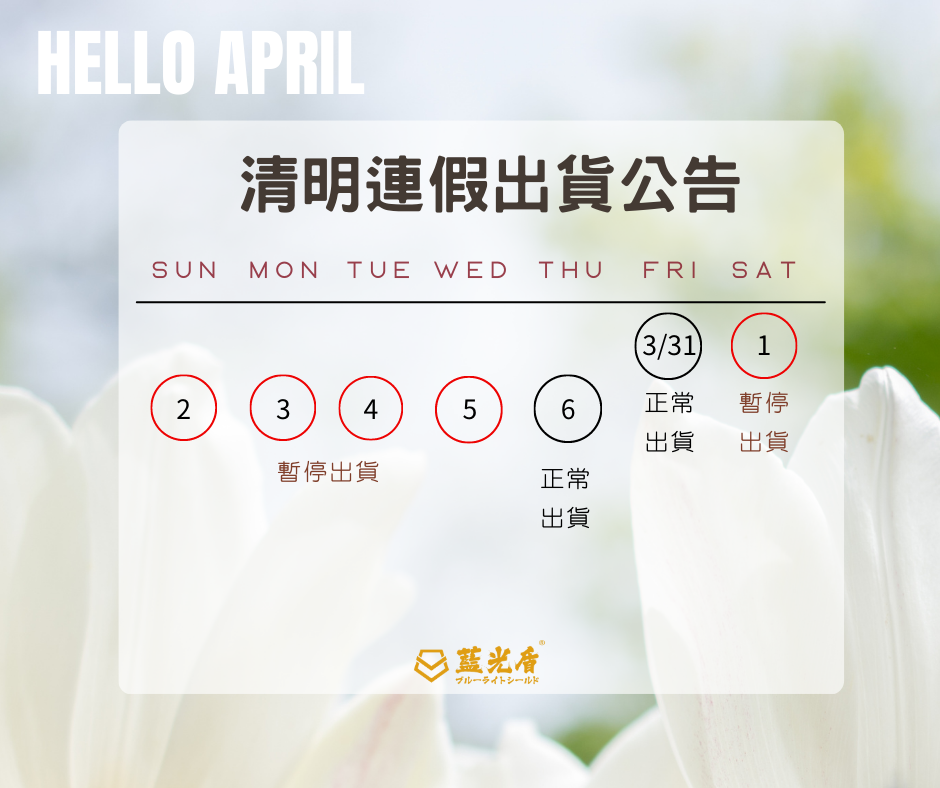 清明連假期間,出貨時間將會在4月1-4月5暫停,4月6出貨將會照常進行,但可能會因物流公司繁忙而有所延遲。